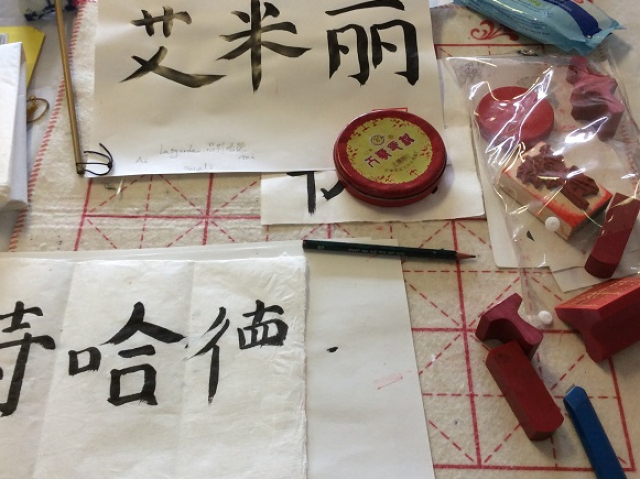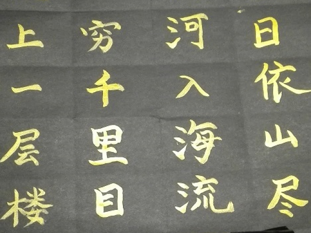 We zullen met Japans pocket penseel (met gouden kleur inkt) op zwart papier schrijven. Wat we zullen schrijven is een Chinees gedicht uit 1930.