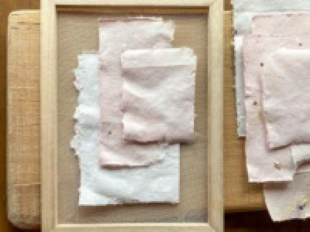 Met deze handgeschepte vellen papier gaan we kaartjes maken en een boekje inbinden tijdens het tweede lesmoment.