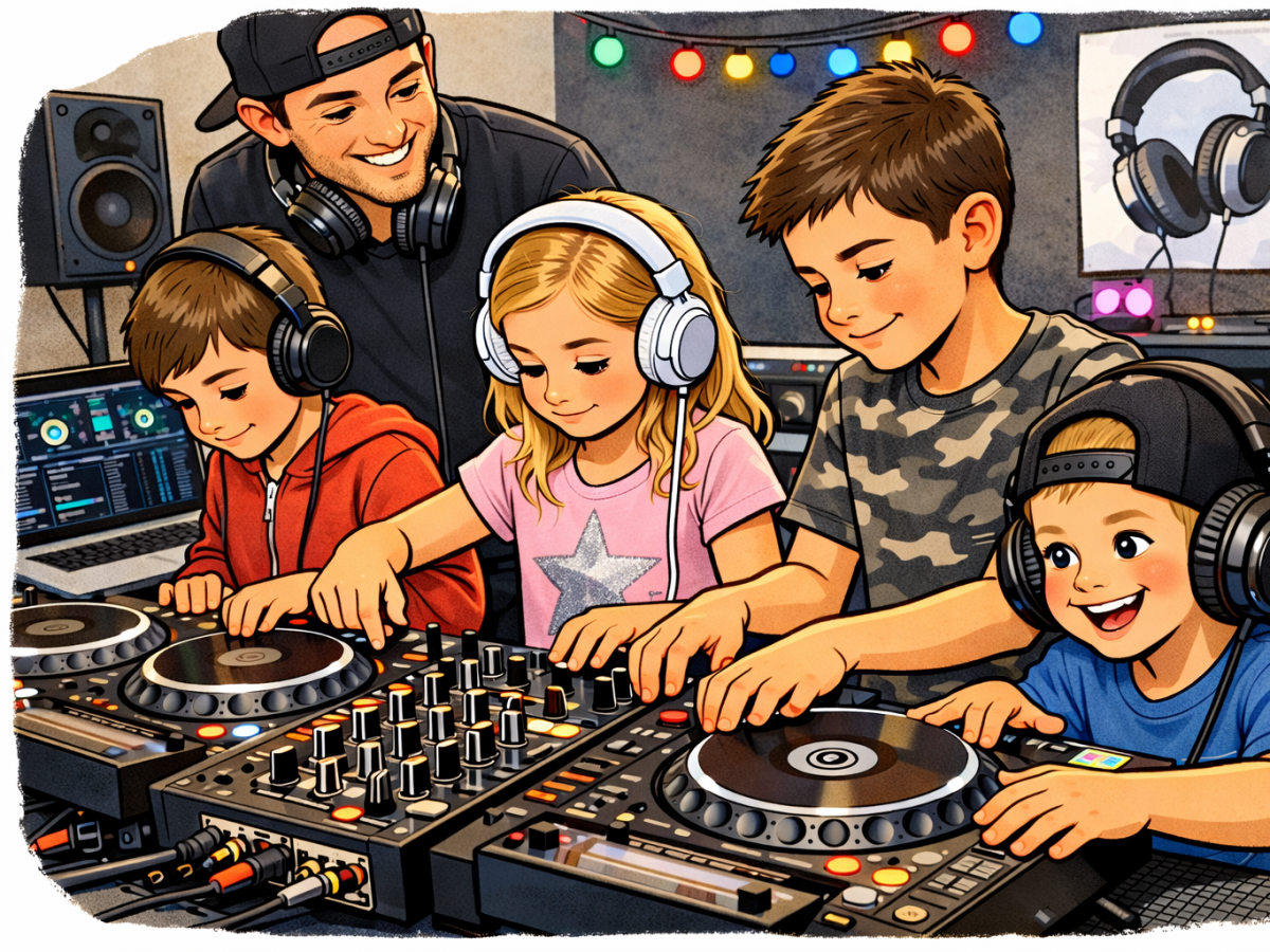 Stap voor stap leren ze wat een DJ doet, hoe ze nummers kunnen mixen, effecten gebruiken en zelfs een eigen mini-set draaien.