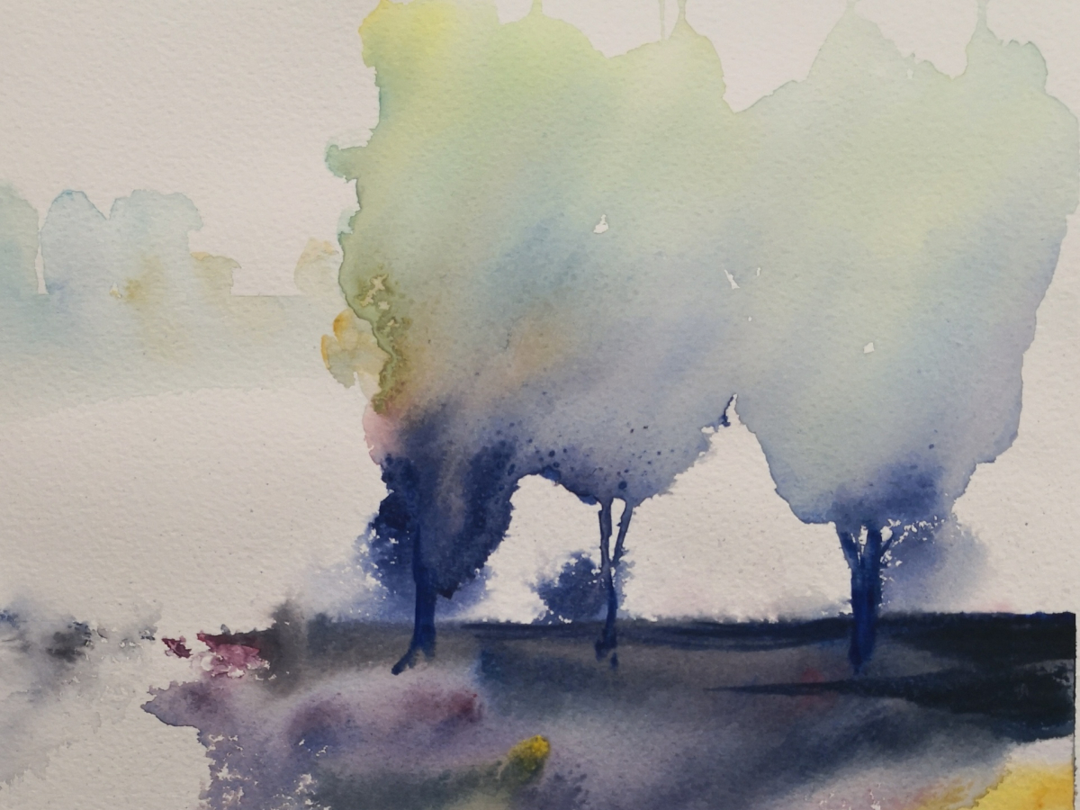 De eerste les is zoals gebruikelijk een 'loswerk'-les, waarin iedereen uitgenodigd wordt te experimenteren met aquarel en door de lesgeefster voorziene materialen.